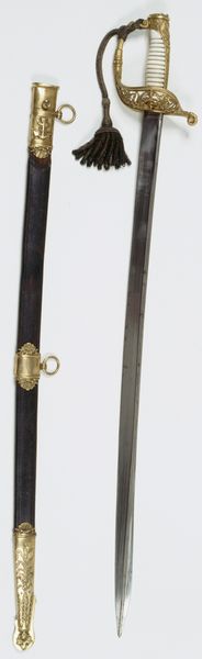 Editor: So here we have, dating from around 1811 to 1814, "Sabel met schede van de Gardes d'Honneur" – a saber and its scabbard that once belonged to the Guards of Honor during the First Empire. Crafted by Johann Schimmelbusch using metal, it strikes me as rather austere, all sharp edges and gleaming surfaces. What do you make of it? Curator: Austere, yes, but think of what it represents. Not just cold metal, but power, allegiance, perhaps a touch of desperate grandeur. Hold it up to your mind's eye alongside Delacroix's Liberty Leading the People – same era, very different feel, but both touched by revolution and empire. Now, feel the grip. What do you imagine holding it? Editor: I imagine a soldier…proud but probably scared? Maybe young. This saber, it’s a tool, but it’s also this really potent symbol. The curve of the blade is surprisingly elegant, I'd almost call it beautiful if I wasn’t aware of its purpose. Curator: Exactly! Beauty born of purpose, elegance in lethality – a key element of neoclassical design. Close your eyes and imagine being in that time and being Napoleon's honour guard. Now open your eyes and tell me, what does it make you consider regarding modern times? Editor: How different, and how similar things are. We don't use swords anymore, but there's still so much...symbolism in tools and weapons. It makes me think about who decides what is beautiful, and what isn’t. Curator: And that, my dear Editor, is the question every good piece of art invites us to ask. Swords to ploughshares, as they say.