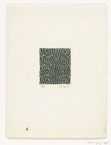 Curator: Let’s take a look at Joan Miró’s "Untitled [plate LXII]", a print from 1958. Editor: I’m immediately drawn to the singular spiral shape, floating there. The blue ink against the stark white… it feels almost playful, yet a little lonely. Curator: Yes, playful, I think, is right. The method Miró uses in printmaking during this period—allowing for texture in the application of ink and chance in the registration—becomes part of the final piece, and a new way to see and realize form. This departs somewhat from pure abstraction, right? The printing process isn't entirely hands-off. Editor: The spiral itself is heavy with cultural meaning. Think of ancient symbols, pathways, the unfolding of the universe…and yet Miró’s rendering feels so childlike. It's this primal connection to visual language that makes it feel familiar, but not fully legible. The way that it hangs there isolated brings the image into relief. Curator: You've really nailed down how he utilizes symbols. Considering what art supplies were easily available to work with at that moment in time, it must have been an opportunity for the Surrealists like Miro, to go big with gestural abstraction. This looks almost improvised! The Art Informel movement was really emphasizing those aspects of work, the moment and the material coming together, like an expression from nothing into something tangible. Editor: The seeming simplicity is deceptive. I’m convinced that Miró intentionally utilizes that ambiguity. A symbol can’t truly function without it. Does this drawing symbolize more, or nothing? Curator: It's fascinating to see how Miró was committed to art-making throughout the artistic movement in history, and I appreciate his process in action as a visual language. Editor: Agreed, there is still mystery in Miró. An exercise of visual archetypes laid bare, almost primal, for anyone looking at it to imagine.