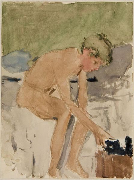 Curator: Denman Waldo Ross's watercolor, "Seated Nude Male on the Beach," presents a figure almost dissolving into the sand. Editor: It's a very sensual image; the soft brushstrokes and muted tones create a feeling of languid intimacy. Curator: The composition is quite interesting. Ross uses a limited palette, primarily focused on variations of beige and blue to explore the formal qualities of the scene. Note how the figure echoes the horizontal orientation of the sea, reinforcing the image's structural stability. Editor: I wonder what Ross intended with such intimacy on public display. Considering its potential audience, the image seems to navigate the boundaries of propriety. Curator: Perhaps it's an attempt to explore the relationship between the idealized male form and the natural world, examining how the body interacts with its environment through careful deployment of tone. Editor: It certainly invites us to consider the evolving attitudes toward the human body within art and broader culture at the time. I appreciate how this piece quietly complicates our perceptions.
