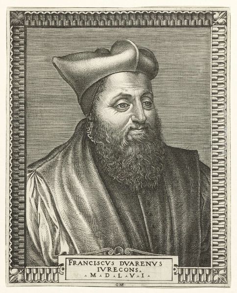 Lucas Vorsterman I created this engraving, “Portret van Hans Holbein (II),” in the 17th century. Vorsterman, working in the politically fraught environment of the Dutch Golden Age, immortalizes Holbein, an artist who had lived a century before. This portrait captures Holbein at 45, a moment where he was celebrated as a royal painter in England. Holbein’s identity as a court artist is clearly expressed through the Latin inscription, which praises him as a painter favored by Erasmus. The fine lines of the engraving capture the textures of Holbein’s beard and the soft fabric of his cap, creating a sense of intimacy. This image reflects the cultural values of Vorsterman’s time, looking back to the Renaissance for artistic inspiration while creating a sense of historical continuity and national pride. The inscription reinforces the idea of artistic legacy, suggesting that Holbein's reputation would endure through time. The artwork then is not only a portrait but also a statement about art's capacity to transcend mortality.