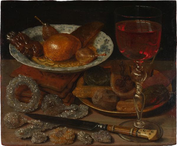 Editor: This is "Oysters, Fruit and a Wineglass on a Stone Table," painted between 1671 and 1679 by Abraham Mignon, using oil paint. It has such a somber, dark atmosphere. What do you see in the way the objects are arranged? Curator: Immediately, the formal arrangement captures attention. Mignon orchestrates a composition around contrasting textures and shapes. Note the rough exterior of the oyster shells against the smooth, reflective surfaces of the glassware. It’s a play between the natural and the artificial. Editor: Yes, and the light seems to emphasize that contrast even further. Curator: Precisely. Consider how the artist manipulates light to create depth and volume. The light isn't just illuminating; it’s sculpting the objects, highlighting their three-dimensionality. Look closely at how Mignon uses chiaroscuro. Can you discern a deliberate pattern? Editor: Well, there's definitely a strong contrast, with light mostly concentrated on the fruit and oysters, pulling them forward. The background is practically black. Curator: Exactly. The dark background throws the items forward. Beyond mere representation, it calls consideration for structure, composition, light, shadow, and material reality. The texture itself— the palpable smoothness or roughness of objects — functions semantically. Editor: It's amazing how much can be communicated through the most subtle formal elements. I’m viewing still life differently now! Curator: Indeed. Appreciating such elements unveils dimensions far surpassing surface recognition. The real voyage of discovery consists not in seeking new landscapes, but in having new eyes.