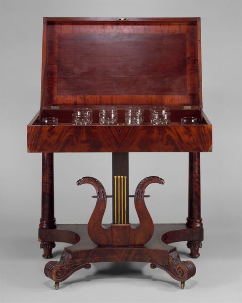Curator: It's quite imposing, isn't it? So vertical and ornamented. Editor: Definitely commands attention. What exactly are we looking at? Curator: This is a "Cabinet" created by Herter Brothers, dating roughly from 1879 to 1882. We are looking at it here at The Met. It is primarily made of wood, though the composition looks quite varied. Editor: The first thing I notice is this sort of Chinoiserie effect – these flattened decorative patterns, along with the asymmetry, but contained within a very Western architectural form. I would be curious to examine how immigrant labor contributed to crafting those detailed carvings at the bottom of the cabinet, particularly the stories represented there, and if this cabinet might also represent cultural appropriation. Curator: Exactly. Herter Brothers were known for employing a wide range of artisans. Considering the period, mass production played an important part in furniture construction as cabinetmakers began incorporating techniques for efficiency. The type of wood and its preparation – how it's treated and finished – speaks to a culture of industrial advancements. What about the construction itself? Editor: I find myself dwelling on its function as a repository, really—what kind of status or class assumptions are baked into its presence in the home, promising a space for display and perhaps hiding away prized objects? What does that say about consumerism at that moment, what objects were worth hiding? Curator: The client was often from the burgeoning wealthy classes—families who wanted to show their taste and worldliness. The materiality speaks to luxury, doesn’t it? Not just in terms of expensive woods but in the level of craft involved and how labor and material intertwined in its construction. The whole piece has been cleverly constructed. Editor: It serves as such a clear encapsulation of Gilded Age anxieties, where anxieties about labor and social progress mix with this explosion of material desires, manifested in the cultural object. Curator: It presents, quite beautifully I think, the complex relations of that time. Editor: Exactly— it presents these themes, asking us to continue examining their construction and impact.