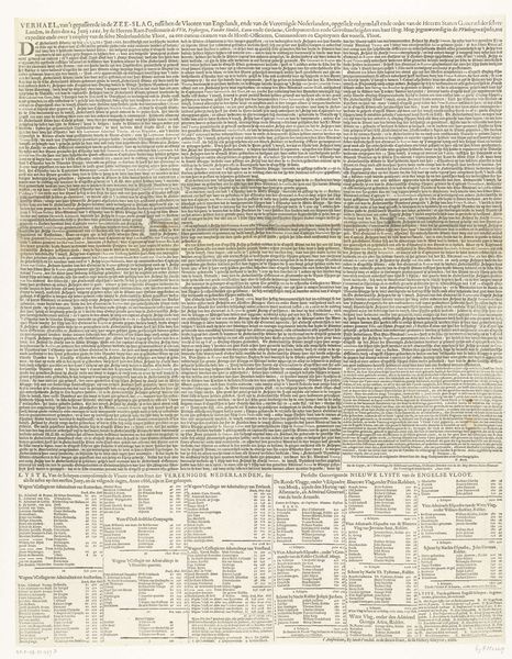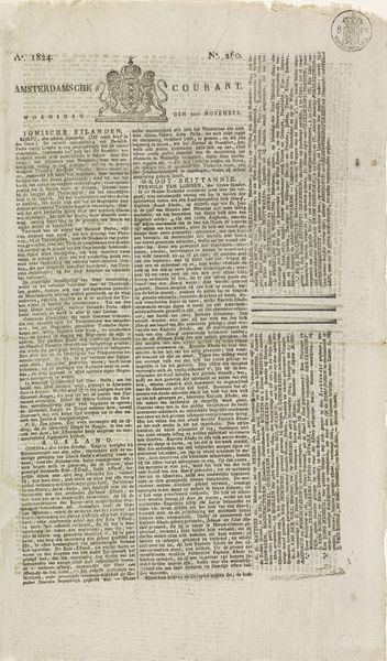 Curator: A field of text. Impenetrable, yet somehow ordered. Editor: Indeed. This is the "Leydse Courant van 2 februari 1807", possibly dating from that same year. What we have here is an engraving and typographically printed newspaper crafted by weduwe Anthony de Klopper en Zoon. Curator: The paper itself becomes the art, then. A field of ideas and declarations, presented starkly, relentlessly. The lions framing the coat-of-arms at the top feel… trapped, almost overwhelmed by the sheer volume of language below them. Editor: That heraldic imagery is fascinating. The lions, yes, but above them, the crown and shield, all representing civic authority and perhaps mercantile power. It anchors the news to a sense of established order, which a newspaper both reflects and actively shapes, of course. Curator: Do you think it reassured readers to have that recognizable symbol placed prominently on the page? I imagine news in those times could be quite destabilizing. This serves as both information and visual reassurance of consistent order, then. Editor: Exactly! Symbols connect people to their shared histories, validating current societal structures. And this piece exists not only as document, but as artifact—its very survival connecting us to those long-ago readers. The Dutch Golden Age comes alive again. Curator: Look closely at the edges. They are worn and distressed. Like the memories that it holds, the symbolic importance feels weathered. Editor: That textural quality really underscores the age and the journey of this artifact through time. I mean, it's just paper and ink, but the choices in typography and layout create such a dense visual texture. It gives us the tone of a past age directly. Curator: Considering how fragile this kind of thing can be, it feels miraculous that it is here at all. The paper's survival gives weight to the persistence of meaning. It begs consideration as a message in a bottle through time, too. Editor: Right! Every element, down to the ink and fibers of the page, tell a part of its story, its context. From heraldic emblem to tattered edge.