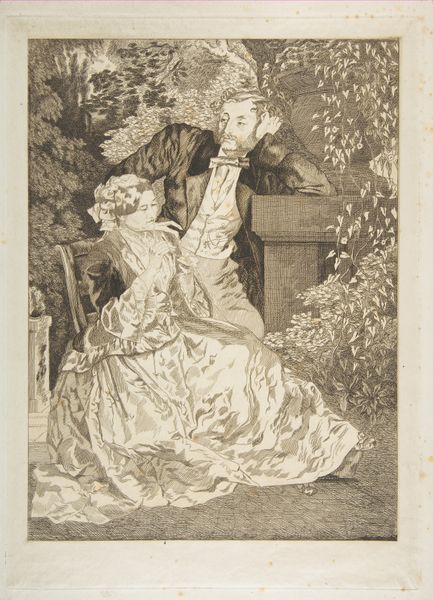 Editor: This is Louise Gaillard’s engraving, "To elskende, der bryder et brød," also known as "L'Amour Fixé," from 1770, here at the SMK. The figures, with their elaborate clothing and hairstyles, give it a definite Rococo feel. What's particularly striking is the moment they're sharing, breaking bread together. How do you read this piece? Curator: As a materialist, I see the broken bread not as mere symbolism of love or fidelity, but as a tangible element reflecting the economic realities of the time. Look at the detail in the costumes – the textiles, the tailoring. These weren’t accessible to the masses. What did it mean to produce and consume those materials? Editor: So, you're suggesting the act of sharing this bread, within that context, becomes… a demonstration of status, perhaps? Curator: Precisely. Bread, in 18th-century France, held significant economic weight. It's tied to agriculture, labor, trade… This simple act, reproduced through the medium of engraving - a process requiring skilled labor and specific materials - takes on a complex significance. It becomes an object of consumption itself. What processes do you think were required for an average citizen to get this engraving, displayed in their homes? Editor: Well, there's the artist's labor, the engraver's skill... And the materials: the paper, the ink... It highlights how even seemingly simple artworks are embedded in layers of production and social context. I hadn't considered the bread itself as part of that material network. Curator: It's all about unpacking the layers, from the pigments to the pastries. Everything speaks to a larger network. Editor: Right! Looking at art through the lens of materials and production reveals so much more than just aesthetic appreciation. Curator: Exactly, it exposes the socioeconomic foundations upon which art, and indeed society, is built.