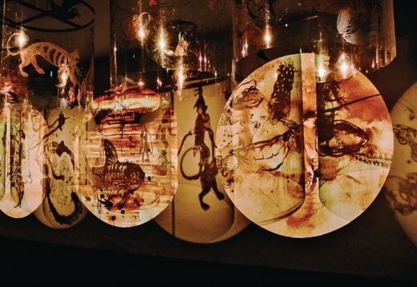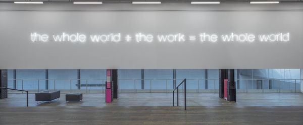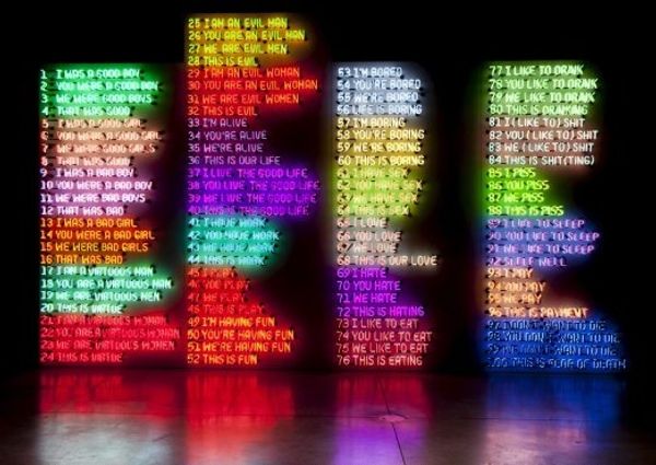 This untitled piece by Jason Rhoades is like a three-dimensional word cloud, hanging in space, made with neon lights. The whole thing shimmers with energy. Think of it as mark-making in the air, a process of illuminating thoughts. What strikes me is how Rhoades treats language as raw material. Each word glows with its own color. I can see “Midnight,” “Beef,” and “Notorious” flickering, but it’s the way he clusters these phrases that makes them sing. The neon tubes aren’t perfect; they wobble and stutter, but that's part of the charm. It’s as if the words are buzzing with their own internal electricity. This tangled web, full of words feels so visceral and immediate. Rhoades reminds me a little of Bruce Nauman, they both share that love of language. But while Nauman can be a bit colder, Rhoades is all-in, chaotic, and buzzing with life. He embraces ambiguity, letting the phrases float and collide, creating a space of pure, unadulterated energy.