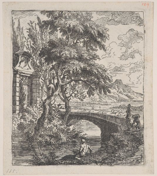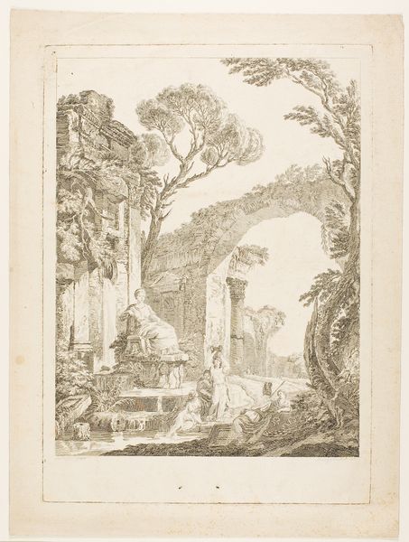 Louis Fabritius Dubourg created this etching titled "Arcadian Landscape with Shepherds by a Stone Arch", sometime before his death in 1775. Notice how the artist's focus on line and form gives the pastoral scene a structured feeling. The composition draws our eye through a network of carefully placed trees towards the ruined archway. The arrangement of the trees isn't random. The contrast between their density on the right and openness on the left creates a visual rhythm. This rhythm, combined with the linear precision of the etching, structures the landscape. Look at the foreground where the figures of the shepherds are placed. These figures aren't merely anecdotal but integral to the composition, anchoring our gaze. The archway beyond acts as a frame, destabilizing the traditional view of landscape art. The entire image is composed around a series of spatial and structural relationships. It presents an idealized vision of nature filtered through a highly ordered artistic sensibility.
