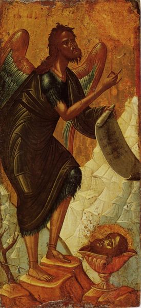 Curator: Standing before us is Andrei Rublev's "Saint Andrew," a tempera painting from 1408, originally located in the Assumption Cathedral in Vladimir, Russia. It's a striking example of Byzantine art from the medieval period. Editor: The first thing that hits me is this incredible sense of quiet melancholy. His posture is almost apologetic, his gaze completely averted. There is something raw, almost unfinished, that intensifies its haunting effect. Curator: The use of tempera on panel tells a story in itself. The pigments would have been painstakingly ground and mixed, the gold leaf carefully applied – the labor a testament to the devotion poured into religious icons during this era. I see that, while worn down, this image's function was clear at one point. Saint Andrew is not some distant ethereal concept but instead the embodiment of contemplation. Editor: Absolutely, the materiality is integral. It’s like the passage of time is physically etched into the image; areas of flaked paint speak of history. The gold peeking through feels not grand but like the fading embers of an idea, a hope. The folds of his robe aren't just about form, it evokes the very notion of burden. Curator: The Byzantine style favored flattened forms and symbolic representation. The elongated figure and delicate rendering are both features intended to distance the viewer from earthly concerns, redirecting focus towards the spiritual realm, though of course, materiality itself tethers us to that earth. It's a dialogue between both worlds, right? Editor: Yes, but look at his hands! They feel incredibly human amidst the symbolism. And that slight inward tilt of the head. There's so much captured emotion and fragility embedded. I wonder what he's reading on that scroll? Perhaps the weight of knowledge, a prophecy that burdens him... It sparks such speculation, makes me think about all of our perceived failures and doubts. Curator: I think considering "Saint Andrew" within the broader context of early 15th-century Russia sheds more light on it too. It was a period of political turmoil, constant warfare, famine, and then there was a constant existential question within the state. So "Saint Andrew" as a whole serves as a symbol of faith and an escape, even if it looks as forlorn as that moment. Editor: It’s this tension, this inherent paradox, that makes it so unforgettable. The icon feels ancient, a survivor; yet it simultaneously embodies this profound vulnerability and introspection. A symbol that both lasts through and is made by change. It's far more emotional and dynamic than one might give it credit for upon first view.