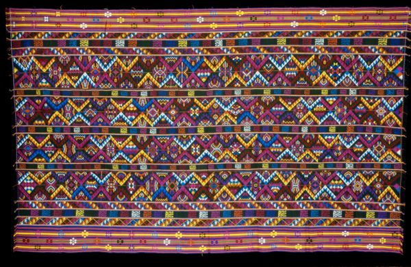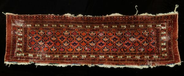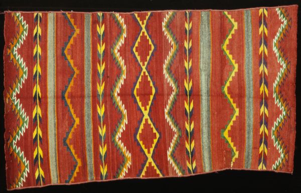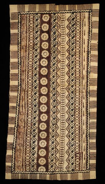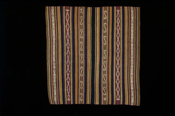 Curator: This is an Aymara poncho, dating from the late 19th to early 20th century, crafted from woven cotton. Editor: It looks deceptively simple at first glance, but something about those repeating geometric patterns feels deeply grounding, almost like gazing at rows of cultivated land. Curator: Precisely! The beauty lies in the construction. Look closely at how the weaver meticulously built up the design, block by block, through the interlinking of warp and weft. Think of the hours upon hours of focused labor to achieve this textile’s final form. Editor: The colors also give pause, there are the dark browns and the pops of red, blues and yellows that almost appear dyed through with minerals. Do you think that these natural elements contributed to the original significance of the cloth for its wearer? Curator: Undoubtedly. While we can only speculate about the original owner's individual story, the patterns speak volumes about Aymara cultural heritage, the environment and access to certain materials within it. Each small change in hue and pattern represents a decision, a small act of creation. These design choices imbue the weaving with stories and memories. Editor: So, it’s both functional and incredibly communicative, then. Did the weaving process or access to materials carry any specific value in Aymara society? Curator: I imagine so. When you look at the quality of this cotton textile and the complex weaves displayed here, it reflects a society valuing resourcefulness and refined craftsmanship. Each poncho was more than mere clothing. They provided warmth, identity, and connection to a rich cultural legacy. Editor: That changes everything. Now the patterns remind me less of landscapes and more of interwoven experiences, labor, tradition… Curator: A beautiful reinterpretation! And one more example of how textiles allow makers to embody narratives of cultural exchange and innovation across decades. Editor: Textiles really do tell tales in intricate ways, and understanding those stitches makes one more alive.
