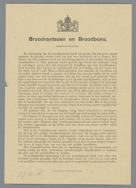 This is a pamphlet created by De Avondpost, and it's a document that speaks volumes about a specific moment in time, printed with what looks like pretty basic equipment. The texture of the paper, slightly aged, gives it away. You can almost feel the ink slightly raised on the surface, a testament to the printing process. The monochromatic palette focuses your attention. The crest at the top feels very formal, but the layout of the type is casual and blocky. I imagine it was laid out very quickly. The text, with its urgent plea, "Be thrifty with bread," it really drives home the desperation and the pragmatism of wartime. It's like a stark reminder that even the most basic things can become precious. It has the same attitude as Barbara Kruger, or Jenny Holzer. What do we need? Now? How can we get it? Looking at this pamphlet, I'm reminded of the power of simple materials to convey complex messages, and the role of art as a historical marker, capturing the essence of human experience in times of both struggle and resilience.