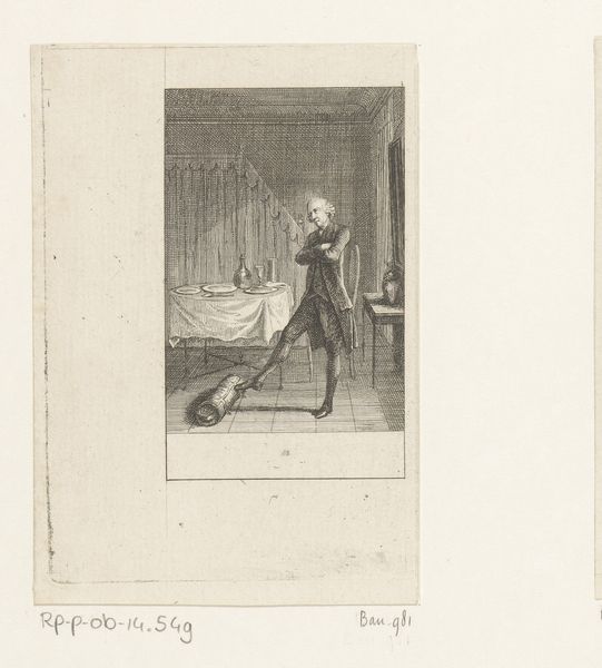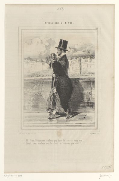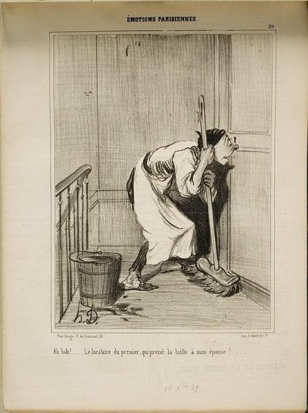 Editor: So, this is Paul Gavarni’s "Dienstmeid opent de deur voor een jongeman," made in 1843. It's an engraving, a scene of a maid opening the door to a young man. It feels...awkward, somehow. The angle, his exaggerated pose... What symbols do you see in this work? Curator: It’s the tilted axis and angularity that throws the eye! This awkwardness you feel speaks volumes. Gavarni masterfully utilizes caricature here, a symbolic language. The dandy's exaggerated posture is instantly readable – he’s peacocking. Notice his cane, the top hat—these are emblems of bourgeois aspirations. How do they contrast with the figure of the maid? Editor: Well, she seems much smaller, peering out tentatively. Curator: Precisely. Her hesitance, framed in the doorway's shadow, implies a societal divide. Consider the era—1840s Paris was seething with class anxieties. Gavarni's piece becomes a coded commentary. "Les Lorette," which heads the piece... what connotations does that invoke in your mind? Editor: I… I don't know. Something about "Laura"? Curator: Think along the lines of "courtesans." He's hinting at the socio-sexual tensions bubbling beneath the surface, where innocence is presented against presumed decadence. The doorway itself—thresholds symbolize change and potential—amplifies this charged interaction. This simple scene bristles with social commentary, rendered unforgettable through carefully deployed visual cues. Did you notice that the maid hides herself in a small corner to avoid opening the door fully? It almost looks like it could come from one of Hogarth's satires. Editor: It’s interesting to think about all the hidden layers of meaning in what seems like just a simple depiction of a maid answering the door. Thank you for bringing all the symbols and historical details to my attention! Curator: It is an invitation to see that images hold stories—memories etched in lines and forms, waiting to be rediscovered!