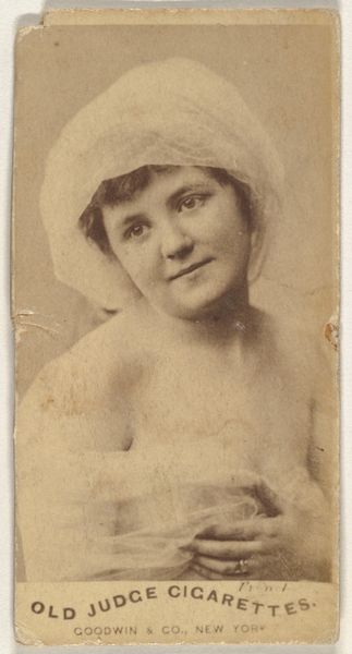 This is a photograph, “Card 1093, from the Actors and Actresses series (N45, Type 2) for Virginia Brights Cigarettes,” made by Allen & Ginter. The sepia tone and small format create a sense of intimacy, focusing attention on the subject’s face and the drape of fabric across her body. The composition is simple, with the actress positioned centrally, her gaze directed slightly upward. The texture of the print itself, aged and slightly worn, adds another layer to the viewing experience. The formal elements, in their simplicity, speak to a larger cultural moment. The careful arrangement of light and shadow serves to highlight her features, conforming to standards of beauty. The advertisement suggests a semiotic relationship between actress, cigarette, and consumer. Consider how the photograph functions as a signifier, not just of an individual, but of aspirations and desires circulating within the cultural landscape. The photograph invites us to reflect on the interplay between image, commerce, and the construction of identity.