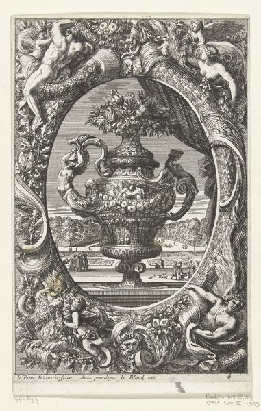Curator: This title page, "Fontaines et Cuuettes", was created sometime between 1700 and 1800. It’s currently held in the Rijksmuseum and was produced as a print by Jean Lepautre. The medium is engraving, employing metal. Editor: The density of line is just staggering. It’s creating a striking baroque visual impact. There’s a sense of luxury but almost claustrophobia too; all of these minute details seem designed to impress, and the visual compression somehow hinders enjoyment of it. Curator: Consider how Lepautre used line—the textures are illusions meticulously rendered by his hand and burin. Semiotically, fountains during this time stood for abundance, grace, and also, power. These were important social values during the baroque era, when decorative art and art in general were viewed as embodiments of affluence. Editor: Right, this aesthetic of opulence really had implications for most people who were of lower social strata. Lepautre seems to have really soaked up the political agenda that surrounded the Sun King and similar absolute rulers. By visually celebrating excess, they upheld the political order which was largely based upon massive inequities in wealth distribution. Curator: Perhaps. It also seems fair to note how elegantly he’s balanced form and composition. Observe the ornamental frame – it cleverly counterbalances the mass and complexity of the central fountain structure. Also note the symbolic forms and the overall structure, which lend itself well to semiotic examination. Editor: Okay, that's a good reading, although the semiotics of this print are really loaded. It invites us to think critically about how spaces of spectacle and visual messaging really impact society’s understandings and expectations. Curator: Indeed. Lepautre’s mastery creates both tension and visual delight through highly formal artistic means. Editor: And it all contributes to a grand performance. One where wealth and power perform for an audience within these decorative constraints. Curator: Well, I am pleased we can concur, at least in terms of influence and legacy. This piece shows just how impactful and evocative his designs continue to be, centuries later. Editor: Absolutely! An insightful way to view these visual complexities.