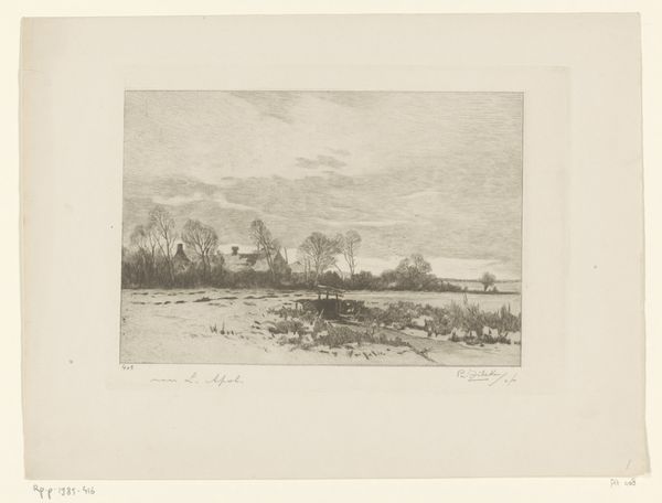 Editor: Here we have Jérôme Tuyttens’ "Winter Landscape with Village," created sometime between 1850 and 1883. It’s an etching, a print – it feels very stark and almost lonely to me, just these simple buildings and bare trees. What's your read on this piece? Curator: My interest immediately falls on the process. The etching itself suggests a reproducibility, a democratization of art. It's no longer a unique painting but an image available, theoretically, to a wider audience. Who would have consumed these images, and why? Were they bought or traded? What narratives about the land, about ownership, were being passed through such prints? Editor: So you’re focusing on how the printmaking process itself impacted its social role? Curator: Precisely. Etching allows for the artist’s hand to be both present in the mark-making, the delicate lines that describe the winter scene, but also distanced through the chemical processes and printing. How does this blend of intimate labor and industrial method shape our understanding of the depicted landscape? Was it seen as objective, or deeply subjective? The means of production complicates any simple interpretation. Editor: I see. The "realism" tag made me think of accurate depiction, but you’re highlighting how even a "realistic" image is shaped by the artist’s choices of technique and material, and its later use as an object? Curator: Exactly! And how the consumption of such images might feed into a particular worldview about land, labour, and rural life. The material gives rise to the social, constantly reshaping our perception. Editor: I hadn't considered it that way – I’m seeing a lot more in this now! Thank you! Curator: Indeed, looking at art through a material lens, we come to realize that there’s more than meets the eye.