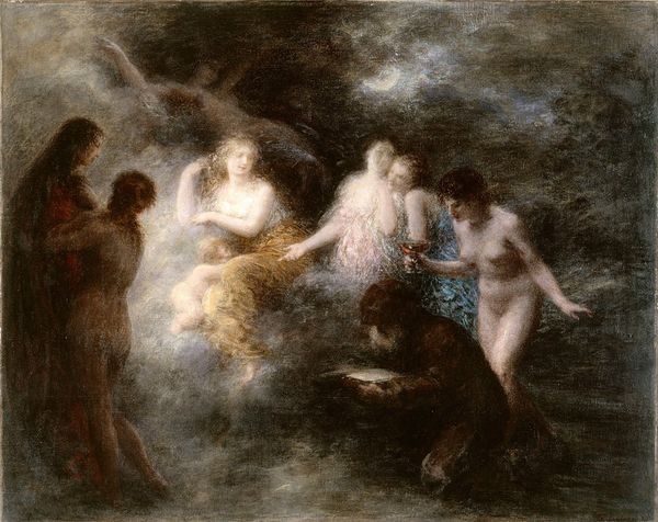 Editor: So, this is Henri Fantin-Latour’s “Hélène” from 1892. It looks like an oil painting. It’s a rather curious scene… the nude figure is captivating but the gathering crowd makes the image rather uneasy. How do you interpret this work? Curator: Fantin-Latour painted this "Hélène" at a fascinating moment in French history, following the Franco-Prussian War and during a period of national identity formation. Given this socio-political backdrop, how do you read the positioning of Hélène within a classical, perhaps even mythologized context? Editor: Hmm, I see what you mean. I guess, at first glance, it felt purely historical or mythological, but framed this way, it makes me think about how dominant narratives can idealize and perhaps even exploit figures, especially women. The crowd seems… judgmental, almost? Curator: Precisely. Hélène, a figure of legendary beauty, often blamed for the Trojan War, becomes a potent symbol. Think about how female beauty has been historically weaponized, turned into a tool of conflict and justification for male ambition. What does this suggest about the painting's engagement with contemporary social dynamics of the time? Editor: That's really interesting. I hadn't considered the layers of social commentary. It feels like a critique of the way society projects its desires and anxieties onto women. Is Fantin-Latour somehow pushing back against those narratives? Curator: It's possible. Fantin-Latour’s work often dances between admiration and critique, questioning the established codes of beauty and power. By painting Hélène surrounded, almost besieged, by figures in varying degrees of engagement, he's visualizing a discourse, a debate around female representation. This tension opens up new lines of inquiry, doesn’t it? Editor: It certainly does. I initially saw a historical painting, but now I see a complex engagement with identity, gender, and the enduring power of myth. Curator: Exactly, and that is why understanding art involves interrogating the assumptions that we have about history, identity, and gender.