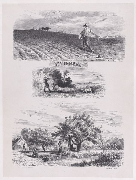 Curator: Let’s spend a moment with "February," an etching from Charles Jacque's "Album of Rustic Subjects," created in 1859. It's part of the Met's collection here in New York. What's your initial impression? Editor: Stark. I mean, immediately I feel a cold, grayness in this print, despite the little scenes of activity, this sense of rural existence reduced to its bones. Curator: Absolutely. I think Jacque beautifully captures that feeling of February—the tail end of winter where everything is hushed and waiting. Looking at it, I can almost feel the brittle cold of the air, see the pale light filtering through those bare trees. And I find myself reflecting on how closely people once lived with the seasons. Editor: He’s certainly telegraphing that idea of harsh realities—especially when you consider the etching process itself. So many hands involved! From the harvesting of raw materials for the paper and inks to the skilled labor needed to manipulate metal. Even if this image purports a sort of naturalistic depiction, it only gets to us through tremendous amounts of highly orchestrated industry. Curator: You know, when I look closer, it is interesting to consider the means of its production alongside the "rustic" themes he portrays. Perhaps it's intended to evoke the romanticism of a simpler existence, the dream of connection to land. Jacque, trained as an engraver, eventually turned to painting rural life; there's something so appealing about the return to pastoral scenes after industrialization. Editor: And that division between a kind of elite artisanal labor against the representation of the poor shepherd speaks volumes. Who buys these prints? Who does it benefit that they exist and circulate? He wasn't naive: his prints are deeply imbricated within structures of class. Curator: It brings to mind how idealized so much art around rural life was during this period, but it’s also impossible to not see, even in Jacque's composition, this longing to understand the beauty that can exist in the everyday. To see how individuals shape and are shaped by the world around them, even as forces much larger operate in their life. It seems less political than a rumination on temporality. Editor: Still, seeing his rendering now prompts me to reconsider where our own contemporary materials originate from—it exposes a continuous cycle. Jacque may portray shepherds by the fire, but his image materializes within our own matrix of production, consumption, and obsolescence.