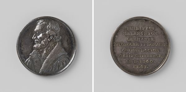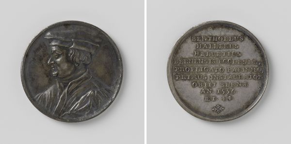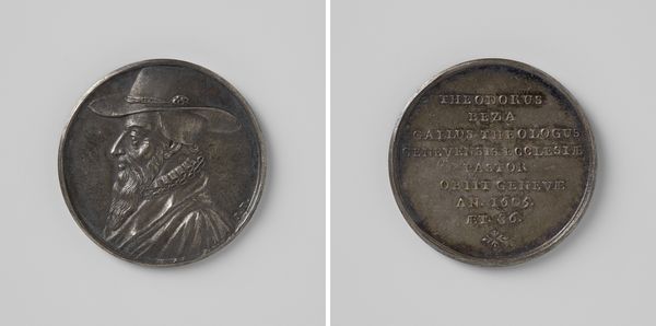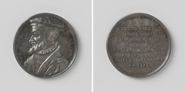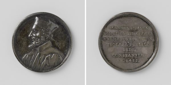 Editor: So this is Jean Dassier’s “Death of John Wyclif,” a bronze medal made in 1725. It's stark, with this profile of Wyclif on one side, and the inscription on the other. What do you see in this piece? Curator: I see a potent reminder of the dangers of challenging established power. This medal, created nearly 400 years after Wyclif's death, serves as a memorial to his radical ideas. Knowing Wyclif was condemned as a heretic, even his remains exhumed and burned, how does the text on the reverse hit you? Editor: Well, it’s pretty direct, stating his bones were burned. There's something incredibly forceful in immortalizing not just his life, but the posthumous persecution he faced. Does Dassier take a side through that depiction? Curator: Absolutely. Dassier, by choosing this subject and explicitly detailing Wyclif's fate, participates in a longer conversation about religious authority and the right to dissent. Do you think the choice of bronze lends particular weight to the statement it makes? Editor: Definitely. The durability of the material itself seems like an act of resistance, a refusal to let Wyclif’s story be erased. Curator: Precisely! Bronze carries a sense of permanence, doesn't it? It speaks to the enduring relevance of Wyclif's challenges to the church. It highlights how his story continues to ignite debate. And makes you question if the debates even finished. Editor: It really reframes how I look at historical objects. This isn’t just a medal; it's a defiant declaration across time. Curator: Exactly! Art can bring attention to historical injustices and celebrate radical figures who changed the course of time. It’s an incredible tool!
