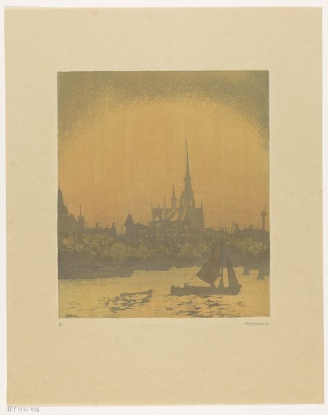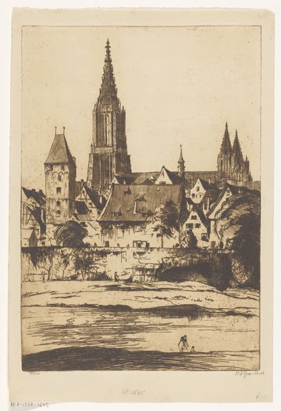 Editor: So this is "Gezicht op Lausanne," an etching by Alexis Forel, made in 1884. It’s incredibly detailed, but also quite moody, almost gothic. What do you see in terms of its historical or social context? Curator: This etching really speaks to the rising interest in urban landscapes in the late 19th century, and how cities were being portrayed and perceived. We often view cities through a lens of progress, but Forel’s print offers something more ambivalent. Editor: Ambivalent how? Curator: Notice the dramatic sky, looming over the city's architecture. It suggests the weight of history, the powerful influence of the Church – symbolised by the cathedral – and perhaps even anxieties about modernization altering traditional cityscapes. Editor: That makes sense. The cathedral really dominates the image. Were prints like these intended for a wide audience? Curator: Precisely. Prints played a critical role in circulating images, shaping public perception and serving as visual records of evolving urban spaces. Prints like these were relatively affordable so views like this could have helped a burgeoning middle class understand and even imagine themselves within their growing urban environments. Consider this artwork within the debates of its time: discussions around urban planning, conservation of historical sites, and the role of religious institutions. How might this image have contributed to those dialogues? Editor: So, it’s not just a picture of a city, it’s actively participating in conversations about its future and its relationship to the past. I never thought of it that way. Curator: Exactly. Understanding its social function reframes our viewing experience. Editor: This makes me realize how much I overlook the societal role of art. Thanks for shedding light on that! Curator: My pleasure. It is about understanding art not only for its beauty but for the complex dialogues it engages in.