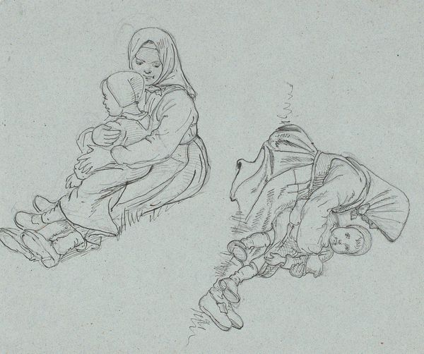 Editor: Here we have Rembrandt van Rijn's "Woman Seated on the Ground with Two Children," made around 1635 to 1640 using pencil on toned paper. The scene has a really intimate, quiet mood. What stands out to you when you look at this piece? Curator: What I see is a powerful commentary on the realities of motherhood in 17th-century Netherlands. The loose sketch hints at the lived experiences of women – their daily lives, which often went unrecorded in grand history. How does this drawing challenge traditional representations of women in art history? Editor: Well, it’s definitely not the idealized portraits you usually see. She's not a goddess or royalty, just a woman, likely poor, sitting on the ground. It feels very human and vulnerable. Curator: Precisely. And it’s crucial to remember Rembrandt’s own social context. How might his own experiences and observations of the world around him – a rapidly changing world marked by increasing urbanization and growing economic disparity – have informed his decision to depict such a subject? Consider, too, the religious context – the emphasis on ordinary people. Editor: That's a good point. The simplicity almost has a religious feel to it, like a Madonna and Child, but in an everyday setting. Did Rembrandt often depict everyday life in this way? Curator: Yes, his unflinching eye saw value and beauty in all of humanity. He saw that the working class was worthy of being subjects of art, countering social and artistic conventions of the time. So, looking at this sketch now, what does it tell us about how art can function as a form of social commentary? Editor: I guess it shows that even quick sketches can make powerful statements about society and who is worthy of being seen. Thanks for the insight, it really helps to see the piece in a broader context. Curator: Absolutely, and hopefully this will encourage you to see how art intertwines with life!
