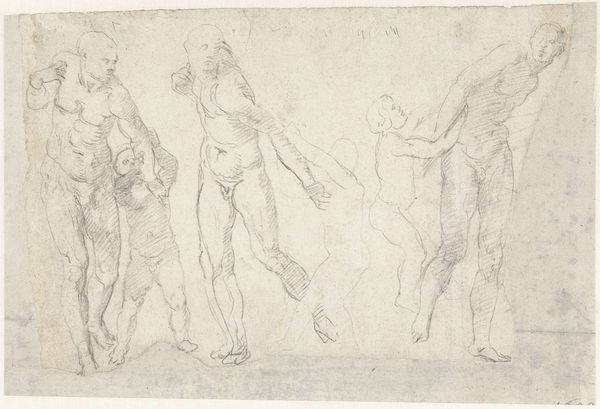 This delicate drawing, "Three Putti at Play," was created by Thomas Stothard using pen and brown ink with gray wash. The composition, focused on three cherubic figures, invites us to consider its formal structure. Stothard employs a limited palette, using subtle gradations of brown and gray to model the forms of the putti. This monochromatic approach emphasizes line and shape, drawing our attention to the dynamism of their poses. The figures are closely grouped, their limbs intertwined. The composition uses flowing lines to convey a sense of movement and playful energy. The texture of the paper, visible beneath the ink, adds a tactile dimension to the work, reminding us of the artist's hand. Such compositions draw on classical motifs, yet Stothard's interpretation injects a certain informality, challenging the rigid conventions of academic art. The drawing may be seen as an exploration of form and movement, where the subject matter serves as a vehicle for artistic experimentation. Ultimately, Stothard's drawing encourages us to reflect on the interplay between form and content, and the ways in which an artist can challenge and expand the boundaries of artistic expression.