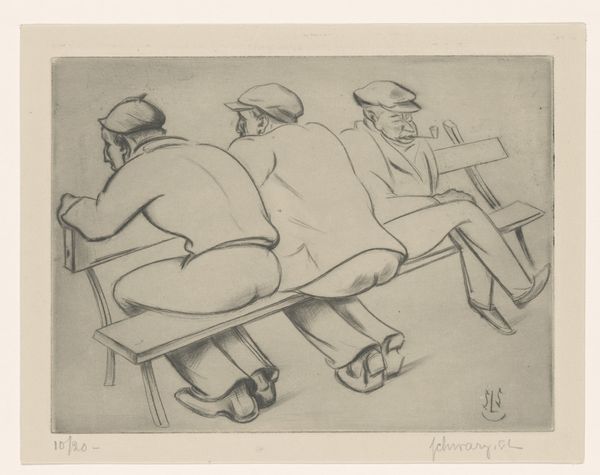 Curator: A remarkable pencil drawing! I must say I'm immediately drawn to its tranquility—almost an uncanny stillness permeating the entire scene. Editor: This is "Slapende jager," or "Sleeping Hunter," created sometime between 1886 and 1931 by Mommie Schwarz. Notice the careful cross-hatching giving volume to the hunter's clothing and the slight recession into the background, rendered entirely with varying pressure of the pencil. Curator: The tension between the hunter's repose and the shotgun beside him is intriguing. There’s a softness in the hunter's slumped form. It humanizes him, making him relatable beyond the predatory role. It makes me question the nature of genre-painting and representation in the first half of the 20th century. Editor: Consider, though, that this work arrives within the social context of early modernism. Mass production, the growth of urban life, the challenge to traditional hierarchy, and burgeoning social movements affected the way artists saw their roles. How might those things shape our reception? The choice to focus on someone at rest—almost defiant. Curator: An interesting challenge. What could have been the social or even artistic pressure to celebrate action, labor, or social involvement instead manifests here as passive observation. He’s merely present in the landscape, connected almost tangentially. Editor: Indeed. And it compels one to think about it as more than mere form. Is there commentary embedded in this quiet tableau, some reflection of the rapidly changing landscape? The flying birds in the background seem to fly unbothered above the scene. Curator: Exactly. The interplay between figure and ground creates a space ripe for decoding. I believe that such thoughtful juxtapositions elevate "Slapende jager" far beyond a simple genre scene. Editor: I appreciate how a seemingly simple sketch holds layers of possible interpretations within the confines of its historical setting. Curator: As do I. Schwarz's ability to construct a moment both timeless and reflective is undeniably masterful.