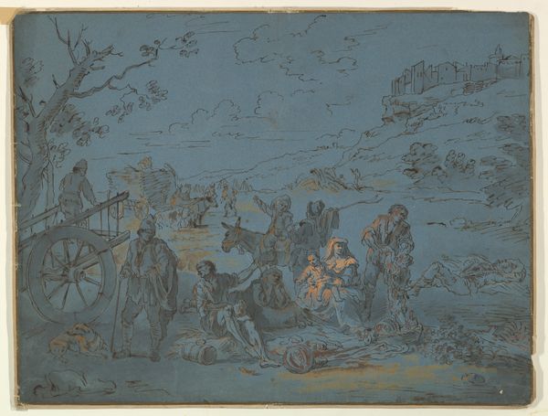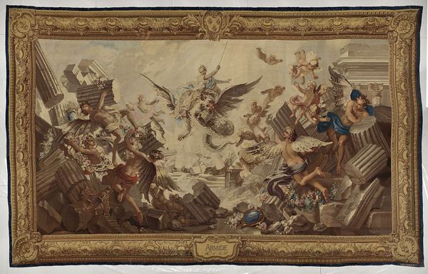 Curator: What immediately strikes me about this piece, this tapestry actually, is the rather turbulent scene. There’s a sense of classical drama unfolding amidst somewhat exotic imagery. Editor: Indeed. This piece, entitled "Africa" from a set of "The Four Continents," was created between 1781 and 1791 by Jean Jacques François Le Barbier. It’s currently held here at The Metropolitan Museum of Art. Given the socio-political context, it’s intriguing to view how Africa, the continent, is being symbolically represented. Curator: Symbolically represented is perhaps an understatement. Look at the bestiary! A zebra-lion hybrid pulls the chariot of seemingly noble figures of color. Then the rather obvious cornucopia signifying bounty and abundance. It almost feels performative in its exoticism. Editor: Precisely! The composition certainly exoticizes Africa, aligning it with stereotypical notions of the time. There's the potential wealth juxtaposed with the chaos unfolding to the right—warrior figures seemingly attacking angelic ones. It creates this image of conflict. Curator: This sense of conflict isn't just visual noise, it reinforces European notions of Africa as a land of contrasts—untamed nature alongside noble savagery. But tell me more about these warrior-like figures; are they directly linked to how Africans were perceived, visually and psychologically? Editor: I believe so. There's an obvious hierarchical display at play. The lighter-skinned woman being offered gifts or tribute and these men, noble but certainly posed as submissive, as almost serving roles, does suggest power dynamics imposed during the late 18th-century colonial expansions. This artwork performs those biases on textile! Curator: And yet, to simply write it off as entirely negative is complicated, isn’t it? Le Barbier created something that is very indicative of European expansion, of colonialism but that is still here on the wall of a major museum hundreds of years later for reflection. Editor: It makes you wonder about our modern iconography, doesn't it? I mean, this artwork invites crucial reflections on the history of cultural bias, imperial ambitions, and how symbols subtly continue those themes. Curator: Absolutely. Art becomes a powerful stage to engage with, reflect and question what has happened, is happening and how we want it to all be viewed in the future.