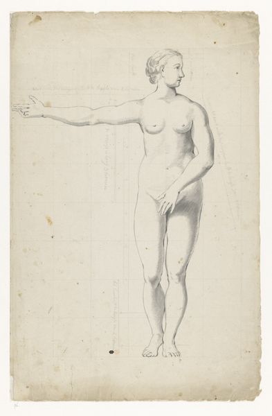 Editor: So, this is Conrad Meyer's "Standing Female Nude," a charcoal drawing from around 1650 to 1689. The warm reddish hue is striking. What’s your interpretation of this piece? Curator: Considering Meyer's materials, the ready availability of charcoal is key. It's a byproduct, really. What does it mean that the artistic process depends on— and arguably elevates — a low status material like charcoal to depict the idealized human form? It suggests a commentary on art production itself and its dependence on specific means and networks, maybe? Editor: That’s interesting. I hadn't thought about the implications of charcoal itself. Curator: Exactly! Think about the social context, too. Nudes were common, yes, but who was commissioning art in Meyer’s time? Was this study intended for further refinement in painting? How does its materiality affect its reception and value in a competitive art market? How was Meyer situated within the system of patronage and artistic labor? Editor: It definitely complicates the idea of just seeing it as a beautiful nude. It makes you wonder about labor, economics, and art. Curator: Precisely. The drawing becomes an artifact of specific social and economic relationships of 17th-century Europe. Think, also, about the supply chains for paper and charcoal – even those contribute to the art object’s significance. Editor: This makes me look at older artworks in a new way. The process matters just as much, or even more, than the subject matter. Curator: I agree. Considering the materials brings us closer to understanding art’s broader cultural function. We've only scratched the surface here, I think.