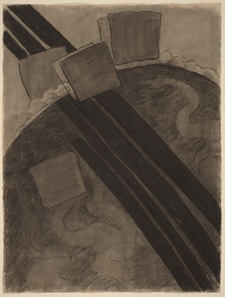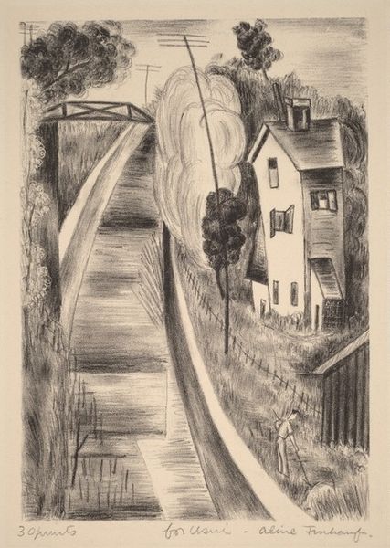 Curator: This is L.S. Lowry’s "Old Steps, Stockport." Look closely at his characteristic style: stark lines, flattened perspective, and an almost haunting simplicity. Editor: There's something undeniably bleak about it, yet the steps themselves feel like an invitation, a path upwards, perhaps away from something. Curator: Steps, ladders, they often symbolize social mobility, a literal climb. But here, the figures are tiny, almost overwhelmed by the architecture. Does it promise true change? Editor: I think Lowry's work often reveals the built environment's impact on working-class life. There's a tension between progress and the weight of industrial reality. Curator: Exactly. Even the lamp post – a supposed beacon – feels more like a sentinel, watching over everything. Editor: Ultimately, Lowry leaves us to ponder: are these steps a way out, or just another cycle in the landscape of urban life? Curator: It's a powerful, if unsettling, vision of a time and place.