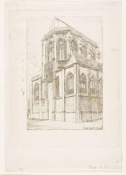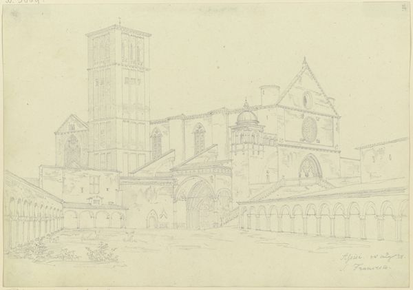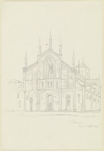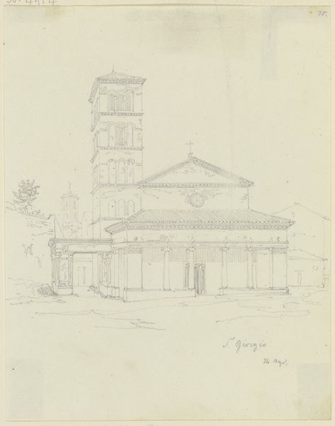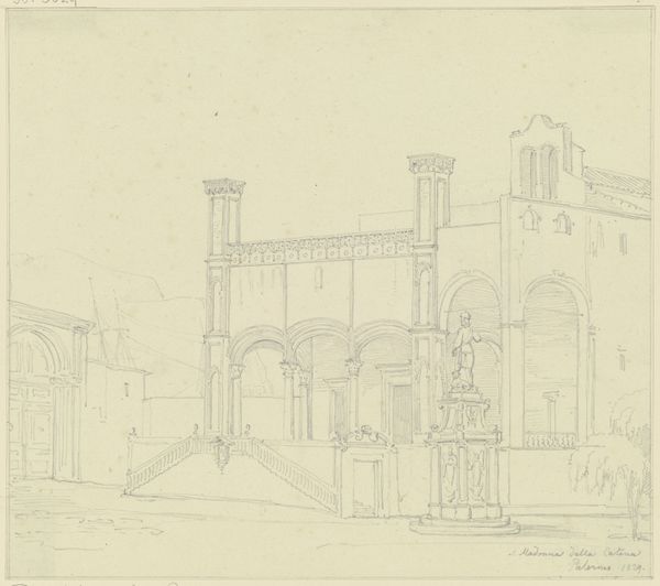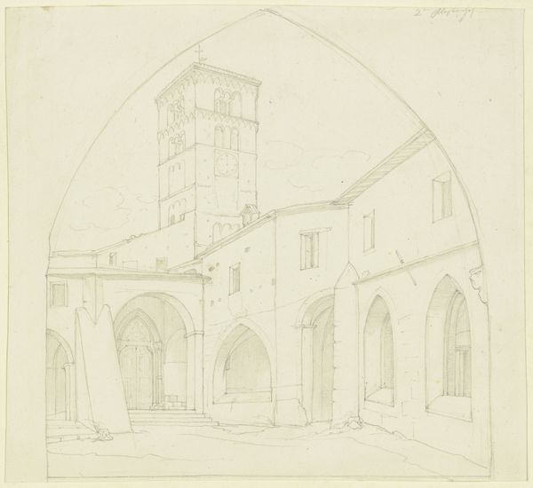 Curator: Before us, we have Friedrich Maximilian Hessemer's "S. Paolo a Ripa d’Arno in Pisa," a drawing likely completed around 1830 and now residing here at the Städel Museum. Editor: The initial feeling is one of quiet monumentality. The muted tones, the sheer scale implied by the architectural rendering... It speaks of a serene strength. Curator: Absolutely. Hessemer meticulously captures the facade of this Pisan church. It’s fascinating to consider the socio-economic context. The labor invested in erecting such structures, the social implications of the church's dominance in Pisa at the time… And the materials themselves—where did they originate? How were they transported? Editor: I'm struck by how the line work, predominantly pencil and perhaps some etching, defines the overall composition. Notice how Hessemer uses subtle gradations of tone to suggest depth, particularly around the arches and doorways. It’s a structured approach, really revealing an academic's precision, don't you think? Curator: Precisely. This is no mere artistic fancy; it is an architectural study. And one that begs the question: what kind of workforce would have been required for this elaborate structure, what skills were required to carve these geometrical features? What's often overlooked in pieces like these is the crucial part played by the unsung workers who materially make such wonders possible. Editor: Still, stepping back, it’s difficult not to get wrapped up in its symbolism. The arches, the symmetrical facade... a divine sense of order reflected by line, tone, and form. It evokes spiritual contemplation. The meticulous details serve a more profound expressive need to touch upon the ethereal quality that lies above, doesn't it? Curator: Undeniably, but Hessemer doesn't just reproduce, but also interprets. This artwork shows an industrial method to making art, and how the conditions and the artistic materials intertwine, and together make architectural visualization practices possible. Editor: Ultimately, viewing this, I am reminded how potent the relationship is between the material and immaterial; where objective recording meets ethereal resonance in the art. Curator: And it’s how the hands who built the place influenced this etherealness, and how this, indeed, changed their hands forever too. Thank you for the experience!