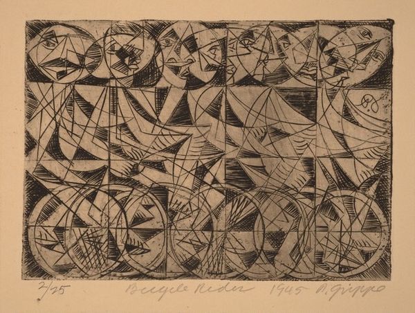 Curator: My goodness, this charcoal drawing just pulsates with anxiety, doesn't it? Editor: Indeed. We are looking at Kazimir Malevich's 1913 drawing, “Death of the Man on the Airplane and on the Train at the Same Time. Illustration for…” Curator: “Illustration for…” Oh, the suspense! What a mouthful of a title. But all I feel is a sense of total fragmentation. It is like the world itself is shattering. I feel dizzy just looking at all those lines shooting off every which way. Editor: Precisely. Malevich harnesses the stark linearity of charcoal to depict a world fractured by modernity. Note the fragmented geometric shapes: triangles, quadrilaterals, all jostling against one another. These shapes, along with the linear network that they constitute, serve as a powerful visual metaphor for the disruptive force of technological progress, especially its impact on human experience. Curator: Disruption is an understatement. I'm pretty sure that dude had a REALLY bad day. He died both on an airplane AND a train… simultaneously! It is so bleak but it makes me giggle too. How over the top can one get? It's wonderfully dramatic! It really feels like you can see the machine and all its modern, scary glory taking someone down. Editor: It’s fascinating how Malevich merges the dynamism of Futurism with Cubist fragmentation here. The stark monochromatic palette reinforces the severity of the depicted event, eliminating any distraction caused by color. This work is all about structural force, existential crisis and it really shows how Malevich grapples with these notions via form. Curator: This makes you really think of just how much humans are able to endure, or even capable of bearing, when technology rushes forward leaving everything that makes us who we are destroyed. How heavy. And now all I want to do is run far away from my phone and maybe hug a tree. Editor: Well said. A somber note perhaps, but an important consideration in relation to Malevich's interrogation of modernity, here so acutely manifest in this singular image of combined devastation. Curator: True. The weight and the poetry both somehow resonate so very much, still today.