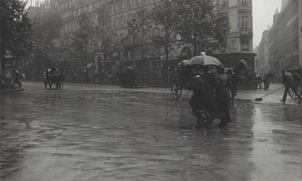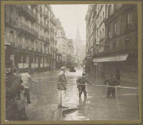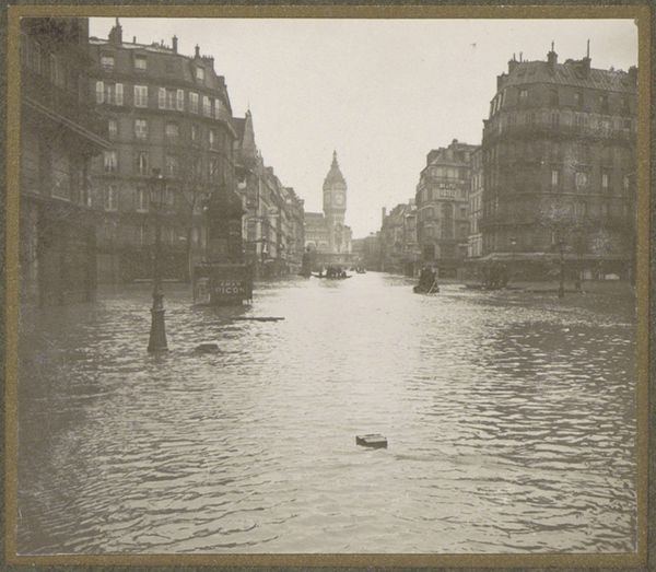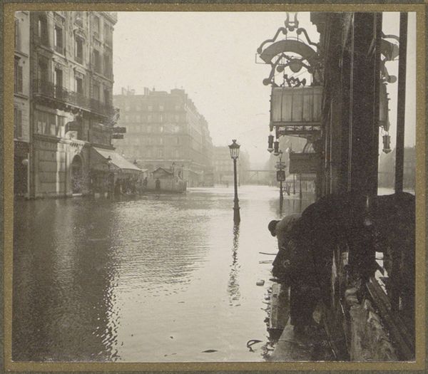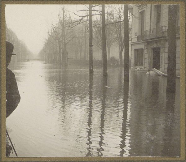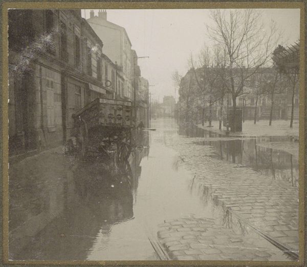 This small photograph by G. Dangereux shows a flooded street in Paris, using a monochromatic palette that evokes a sense of timelessness. It's fascinating how the water dominates the scene; it's not just a backdrop but the main subject, reflecting the buildings and trees in a distorted, dreamlike way. The ripples and waves create these incredible textures, almost like brushstrokes in a painting, obscuring the hard edges of the city and blurring the distinction between reality and reflection. Look at the wooden planks creating a walkway, a practical intervention amidst the chaos. They stand out not just visually but conceptually, suggesting a human attempt to navigate and control this watery world. Dangereux reminds me a little of Atget in his capturing of everyday life in Paris, but with a twist of the surreal. Both share this deep engagement with their environment, each revealing different layers of beauty in the urban landscape. It’s a reminder that art is about seeing the world in unexpected ways.