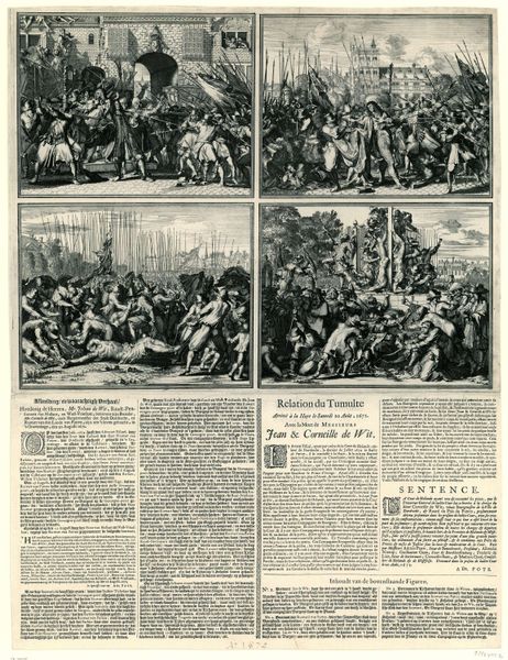 Romeyn de Hooghe's engraving from 1672 depicts "The Murder of the De Witt Brothers," a stark image of political violence in the Dutch Republic. The print encapsulates the tumultuous period known as the Rampjaar or disaster year, when the Dutch Republic was at war with England, France, and several German states. The brothers De Witt, Johan and Cornelis, were prominent statesmen, and their brutal assassination by a mob in The Hague reflected deep political divisions and social unrest. De Hooghe’s detailed depiction includes portraits of the brothers framed by symbols of state, contrasted with the chaotic scene of their lynching. Examining such prints offers insights into the political climate, popular sentiment, and the role of visual media in shaping public opinion. Contemporary pamphlets and archival records can further illuminate the historical context, revealing the complex interplay of power, propaganda, and collective action in the 17th-century Dutch Republic.