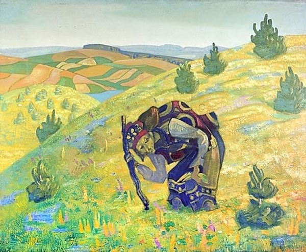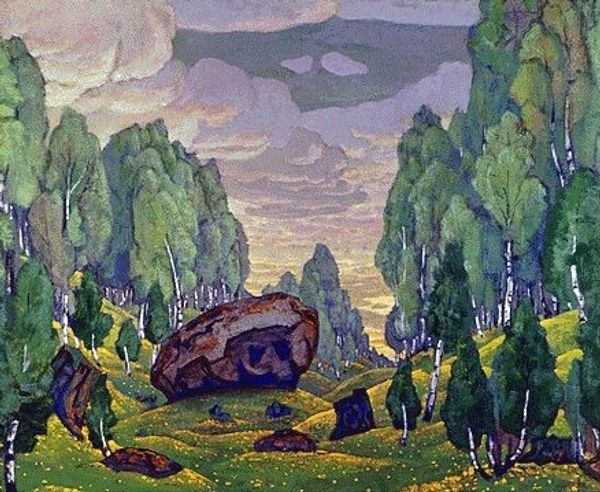 Editor: Here we have "Procopius the Righteous is praying of unknown navigating", painted by Nicholas Roerich in 1914, using tempera. I’m struck by the simple, almost flattened forms, and the intense blues and greens. It gives the scene a mystical feeling. What do you see in this piece? Art Historian: Well, I'm drawn to how Roerich uses tempera. Notice how the matte surface and the layering of pigments emphasize the materiality of the painting itself. Consider where Roerich, steeped in Russian Symbolism, was exhibiting and to whom, who would have been purchasing or not purchasing and how they are experiencing labor at this time? It’s interesting to analyze not only what is depicted, but how those materials relate to social contexts, specifically issues around class, labor and industry? Editor: I hadn’t thought about the tempera that way, just about the colours it produces. Are you saying the materials themselves hold meaning? Art Historian: Precisely. Tempera, unlike oil, dries quickly and demands precision. Its use here speaks to a specific production process, perhaps even a rejection of industrial modes of creation, hinting at the labor involved and possibly pointing to a critique of consumer culture by suggesting slower art consumption and creation. It is by no means incidental that Roerich often chooses pigments of precious origin and intense symbolic power to amplify an atmosphere of spiritual truth in connection with the depiction. Why do you think he picked this process and its connection with craftsmanship to show a religious figure? Editor: Maybe he's drawing a parallel between the saint's dedication to prayer and the artist's dedication to craft? It links the spiritual and the material worlds together. Art Historian: Exactly! And look at the repetitive, almost mechanical application of paint in the sky, compared to the more fluid river. Could that also suggest Roerich’s own commentary about society's movement into an industrial era? Editor: That's really interesting. I was just focusing on the religious aspect, but now I see how much the materials and technique add another layer of meaning. Thank you! Art Historian: My pleasure! It is very powerful how an object communicates the environment and processes in which it was conceived and developed.