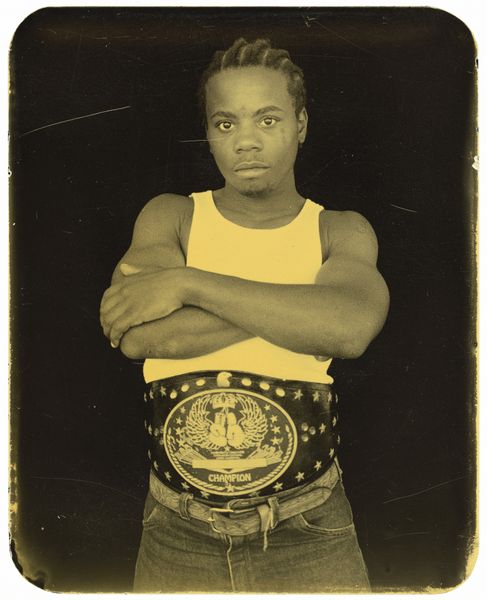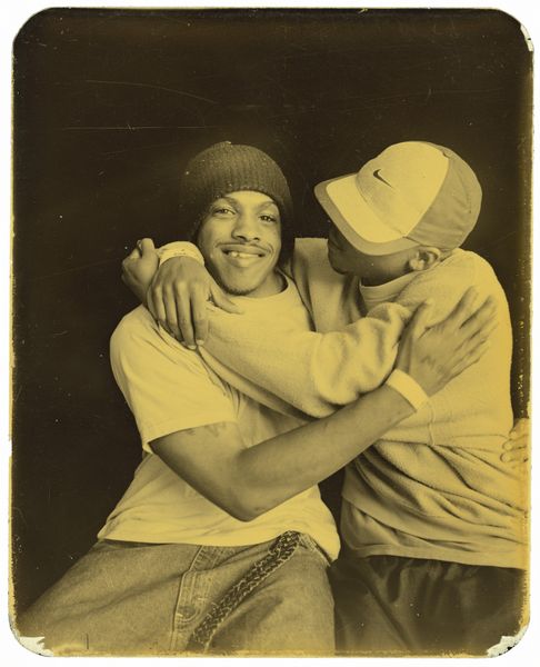 Deborah Luster made this tintype, *Boxers, Angola, Louisiana*, without a specified date, by manipulating light and chemistry. The sepia tones give it a dreamlike feel, like an old memory. The thing about tintypes is that they're made directly on metal, there’s no negative, each one’s unique, unrepeatable, a one-off. Look at the way Luster coaxes the light, how she burnishes the shadows around the figures to create this intense atmosphere of two boxers ready for combat. Notice how the light glances off the surface, creating these ghostly highlights on their faces and clothes. The jeans look almost tie dyed, in a manner that feels like decay or a ghostly residue. The composition gives the portrait this electric charge, a psychological tension. This makes me think of Diane Arbus, who was similarly drawn to the margins of society. Like Arbus, Luster shows us the beauty and dignity in the unexpected. It’s this collision of violence and tenderness that makes the image so haunting.