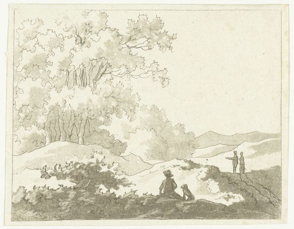 Editor: This undated landscape sketch by the British School uses delicate washes to evoke a serene scene. The composition feels carefully balanced. What do you see in this piece? Curator: The success of this work lies in its strategic use of contrast. Notice how the darker foreground elements—the trees and the suggestion of rocks—frame the lighter, more atmospheric rendering of the distant mountains. It creates a sense of depth. Editor: So, it's the relationships between the light and dark tones, more than the subject matter itself, that make it compelling? Curator: Precisely. The artist manipulates tone and texture to guide the eye and construct space. The sinuous lines implying a path further contribute to a unified composition. Editor: I never considered the lines as a way of creating unity. Thanks for pointing that out! Curator: Indeed. Paying attention to these elements helps us appreciate the artwork's aesthetic success.