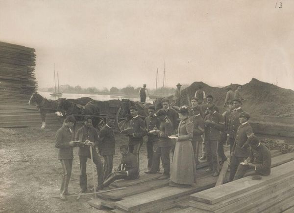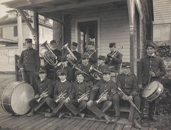 Curator: This is a gelatin-silver print simply titled "Militaire kapel," dating from 1940 to 1945 and held in the Rijksmuseum. The artist remains anonymous. Editor: Wow, stark. Immediately gives you that solemn, slightly off-kilter feeling you get from wartime photography. The tones feel very regimented, fitting for the subject I suppose. Curator: The composition reinforces that feeling. Notice how the linear structure of the building dominates the background. This echoes the strict order implied by the band and the military context, drawing connections between societal structure and imposed control. Editor: Absolutely. And the fact that the horizon line hits just above the heads of the musicians almost flattens them, integrating them further into the architectural structure, don't you think? Makes them feel like part of the architecture rather than a separate living, breathing group. It feels… calculated. Curator: A perceptive observation. Considering its place as a historical document, the gelatin-silver medium grants a sense of authenticity. The subtle tonal gradations afforded by this process contribute to its overall atmospheric and historical value. Note too, if you will, how the tonal balance of the building is slightly offset from the musicians. This emphasizes depth as the tonal differences draw a separation between background and active space. Editor: It does give a hyper-real edge, yes. Knowing the likely setting adds an extra layer – what was the music? Who were these soldiers? Was it a moment of hope, or forced morale? The monochrome lends itself to endless questions about reality and representation. One wonders what a similar photograph rendered in full color could have provided to that representational conversation. Curator: Such historical and aesthetic ambiguities resonate, especially when we apply certain philosophical models. Thinkers have theorized how black and white photography creates a distance, an “otherness” even within reality. The photographer may very well have intentionally tried to tap into a larger thematic representation, who can say? Editor: Well, mystery is part of the appeal here. It invites your own interpretation into the historical narrative and moment depicted within the visual document. This photo really sticks with you. The lack of specifics makes it intensely, personally universal somehow. Curator: I concur; the image successfully provokes analysis and empathy beyond the pure indexical information.