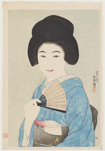 Hasui Kawase made this woodblock print, *Departing Spring,* sometime in the first half of the 20th century. Look at this beautiful woman, her head slightly tilted, her hand raised to her hair in a graceful gesture. There's a real process on display here, the careful carving and layering of blocks to create a delicate, ethereal image. The texture here isn't about impasto or thick paint, but about the quality of the paper, the way the ink sits on the surface. Think about the floral patterns on her kimono—each petal, each leaf, precisely rendered with a subtle range of colors. And that yellow background, just a whisper of color that creates a soft, warm glow around her figure. Notice the lines that describe her face and hair, confident and economical. Kawase uses these small details to create a sense of depth and volume. This print reminds me a little of Utamaro, another master of the Japanese woodblock print. But Kawase brings his own sensibility to the form, capturing the beauty of everyday life. Ultimately, it invites us to slow down, to observe, and to appreciate the subtle poetry of the world around us.