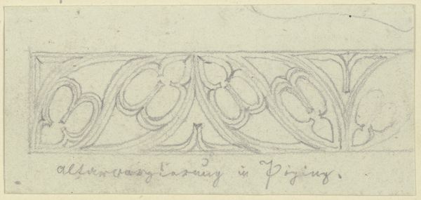 Curator: This delicate drawing in ink on toned paper is called "Freskierte Dacheinfassung von Sankt Nikola in Landshut" and it's by Karl Ballenberger. It’s currently residing here in the Städel Museum. The drawing presents an ornamented, medieval architectural feature, offering insight into 19th-century craftsmanship. Editor: There’s an austere, almost haunting quality to the sketch. I mean, the lines are crisp but the overall tone of the aged paper softens everything, gives it an antique affect that seems deliberate. A fragment frozen in time and paper. Curator: Absolutely, that’s a great starting point to delve into its historical meaning. As a study for a fresco in St. Nikola, this piece is intrinsically connected to religious expression and spatial politics of the time. We need to explore the ways sacred spaces, and by extension, the architecture, were gendered or racially determined. Editor: Indeed. It’s key to acknowledge the materiality here – the pen, the ink, the paper. This wasn’t about individual genius in some detached realm; rather, this sketch served a concrete, functional purpose within a workshop. And this use of pen, indian ink, and paper connects architecture directly to craft work! How fascinating that the sketch may exist more like a personal study inside his sketchbook. Curator: I think it invites crucial inquiries into labor history! Frescoes required not just the initial sketch, but a collective of artisans. What were their social standings? Who had access to this artistic creation? Was skill also somehow associated with gender? These are some relevant questions that deserve analysis. Editor: Definitely, because consider what kind of physical labor created this building! This is also very relevant within architectural historical analysis because it invites questions: was this drawing based on site research? How did Ballenberger construct this as a drawing? I imagine the repetitive nature of creating and reproducing this pattern demanded endurance. This informs our understanding of ornamentation more generally as material labor within cultural context. Curator: Agreed. Analyzing this intersection allows us to unearth so much more about 19th-century social stratification and creative industry, and perhaps draw connections to the politics surrounding preservation, ownership, and artistic authority in architecture. Editor: So this drawing, as humble as it looks, embodies layers of both intellectual design and material implications. It reminds me how labor intersects artistic creation in complex ways, especially within a religious space. Curator: And from that perspective, even a sketch serves as an important, yet also humble document for architectural, social, and art history, providing insights into spaces and systems.