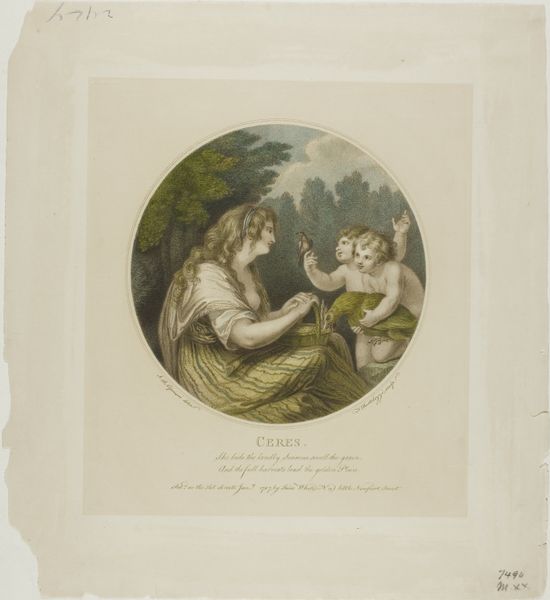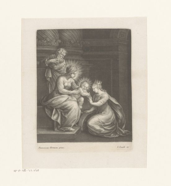 Curator: Looking at this print, the pastel hues immediately give it a delicate, almost dreamlike quality, wouldn't you agree? It’s entitled "Moeder met kind en dienstmeisje," or "Mother with child and maidservant," attributed to Louis Marin Bonnet, likely created between 1782 and 1786. Editor: Dreamlike is the right word, perhaps more of a carefully constructed reverie. I’m struck by the overt symbols. It feels deeply entrenched in its time, you know? Maternal love idealized through this prism of domesticity. Curator: Exactly! You've hit upon it. The tenderness of motherhood in this Rococo style. The print’s engraving technique gives these intimate scenes a unique softness. It is almost like looking at a drawing! There's almost something sly about the artist’s perspective, making the scene relatable for mothers of the era, wouldn’t you say? Editor: Most certainly. Think about what motherhood signified. This image operates as both a representation of maternal love and perhaps also social conditioning, suggesting that one is intertwined. Note how the serving maid looks at the lady who is looking at the child. Curator: Good observation! It’s that subtle hierarchy present in so many genre scenes. Even that little dog gets a look in. A commentary on class, certainly, but also, I think, on the accepted roles and responsibilities. Editor: And notice how all these gaze lines direct us back to the central, essential act: the bonding between mother and child, a visual hymn of domesticity. The very picture of eighteenth-century bourgeois life. The icon of "Mother and Child," forever revisited across centuries, carries different weights. What remains central is how society sees mothers, or wishes to see mothers, I’d say. Curator: Perhaps this engraving serves as a time capsule. It makes you wonder, doesn’t it? The layers within what at first glance seemed merely sentimental. Editor: It does. It brings this eighteenth century world so viscerally to life! I look at it, and my world is a little wider for the seeing.