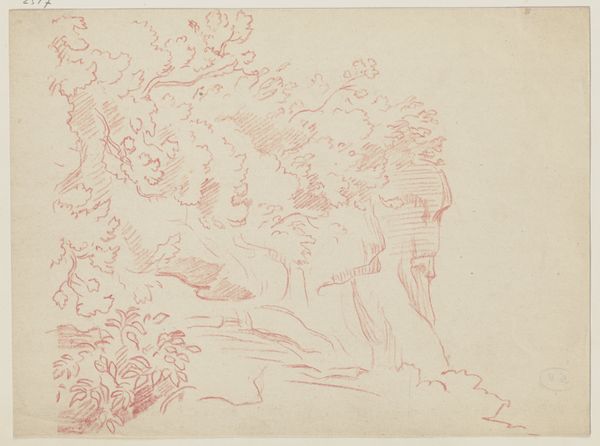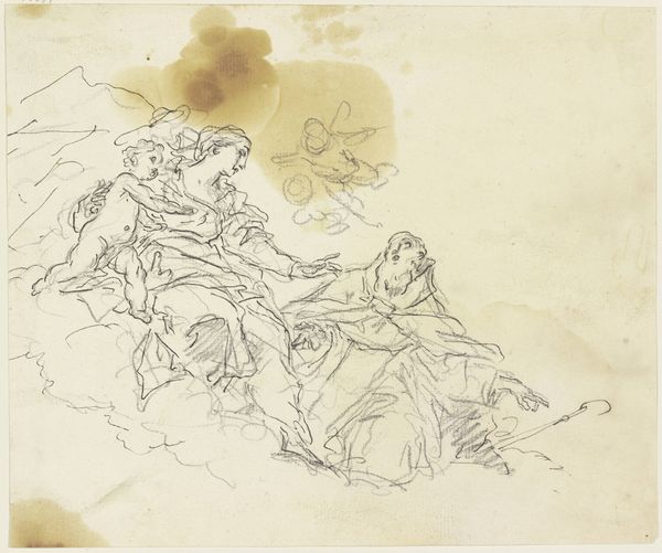 Curator: Looking at this preliminary sketch by Victor Müller, titled "The Princess and the Frog" one immediately senses an ethereal, almost dreamlike quality, don’t you think? Editor: Absolutely, it’s incredibly evocative even in its unfinished state. I'm immediately drawn to the central figure of the princess; there's such vulnerability in her posture. And the frog, barely a few lines, but brimming with implied significance. It makes you think about transformation, doesn't it? Curator: Indeed. It is fascinating to view Müller’s rendering of a fairy tale as rooted in social mores of his period, probably sometime in the mid-19th century, evidenced through his draftsmanship of landscapes and historical settings. Note, for example, the well’s structure-- it is rather representative of a more utilitarian, working class association to a place for drawing water. The setting places the princess away from her inherited status in this liminal public space. Editor: Yes, and consider the symbolic weight of the frog itself. Frogs are often linked to ideas of fertility, the unconscious mind, even ugliness transformed into beauty. Here, that symbolic transformation is still held as possibility. What is interesting about using a pencil on paper to record it for later contemplation. Curator: Precisely, the medium itself offers transparency to its intended creation, especially for an allegorical tale as complex as “The Frog Prince.” Müller positions the story inside a growing debate around the importance of traditional social values and a brewing shift to a more secular perspective of myth-making. Editor: A compelling point. The act of placing a familiar narrative within a contested socio-political climate adds depth to both its symbolic charge and Müller's vision for storytelling. This simple medium underscores the accessibility and adaptability of storytelling, where these age-old concepts of character, setting, and plot are placed to the audience to render complete, much like its form on paper here. Curator: It is the socio-political openness combined with universal meaning that enables the iconographic translation, if you will. A sketch of a moment on paper presents possibilities of public reflection and change through the tale's moral itself. Editor: Looking closer, I think I will carry that impression with me, too—how the raw qualities in Victor Müller's unfinished sketch amplifies the potential found within "The Frog Prince".