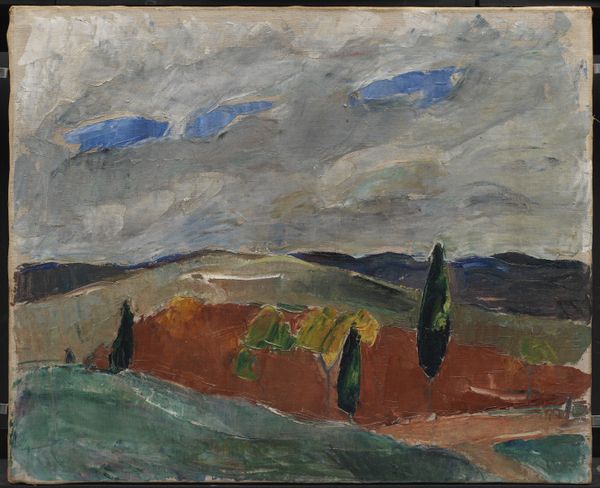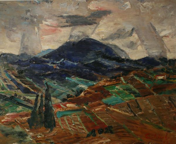 Editor: So this is "Landscape near Martigues" by Maurice de Vlaminck, undated. It's at the Tate, and uses oil on canvas. I'm struck by the layering of colors and how they create depth. What do you see in the composition? Curator: The composition presents a fascinating interplay of planes. Consider the foreground hill, leading the eye towards the middle ground with its suggestion of water, and then to the elevated structure in the distance. Note how Vlaminck employs distinct brushstrokes to delineate these zones. Editor: Yes, the brushstrokes are so deliberate! It almost feels abstract, even though it’s representational. Curator: Precisely. He's prioritizing the formal elements—line, color, texture—over a strict mimetic representation. This challenges our perception of landscape itself. Do you agree? Editor: I do now! It's less about the place itself and more about how Vlaminck interpreted it through paint. Thanks for pointing that out! Curator: A rewarding observation, indeed. This underscores how formal analysis allows us to decode the artist's subjective engagement with the world.