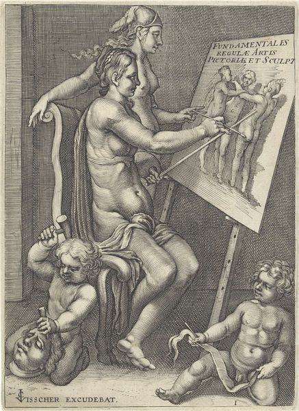 This engraving, "Pictura: allegory of painting," by an anonymous artist, presents a symbolic representation of painting itself. The nude woman grinding pigments embodies the labor and physicality inherent in artistic creation. Meanwhile, the putti drawing below suggest the intellectual and creative inspiration driving the artistic process. The image belongs to a tradition in Europe where art academies sought to elevate painting to a noble art, distinguishing it from mere craft. By allegorizing painting, artists asserted its intellectual and cultural value. They also sought to create a mythology for art, drawing parallels between the artist and classical heroes. The idealization of the nude figure, the mythological references, and the artistic labour, all speak to a need to imbue artistic production with a new level of cultural prestige. Understanding this work requires us to examine not just its formal qualities, but also the social and institutional contexts in which it was produced. Researching the history of art academies and artistic patronage during the time this print was made, helps us grasp the aspirations and social positioning that drove its creation.