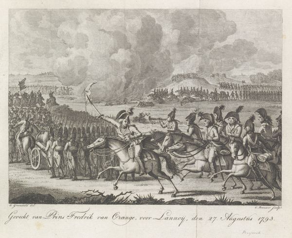 Curator: This detailed drawing, titled "Fransen beschieten de vluchtende troepen op de Gierbrug, 1794", captures a moment of intense conflict. Created around 1803 by Cornelis Brouwer, it's currently housed in the Rijksmuseum. It is created with pencil on paper. Editor: My first impression is that it feels… overwhelming. A chaotic scene. The sharp lines of the pencil amplify a sense of urgency. There are so many tiny figures. Curator: That feeling of being overwhelmed mirrors the historical context. We see the French army targeting fleeing troops on the Gierbrug bridge. Consider the revolution still ongoing. What did this mean to those sketched, those escaping or pursuing? Editor: Yes, look how the artist uses contrasting scales. Figures in the foreground, especially the horses, are given detail, as are the attacking forces below. They become symbols of immediate threat and of resistance. Their presence overshadows the receding, faceless figures representing generalized retreat and defeat. Curator: Exactly. The very act of depicting this scene normalizes the political ideology the work presents: this kind of violence is not happening to anyone individual; it just IS. In looking, we must ask ourselves as to whether we ourselves take on this attitude toward victims of political violence. Editor: What’s also remarkable is the linear nature of the piece. Look at how that line, the literal horizon line, separates land from sky—separating also the mundane lives of people who would call that town home, from the terror they surely felt as the army rolled in to dominate it. Curator: Perhaps there's a suggestion of inevitability, too? That the 'rampspoed', the disaster mentioned in the inscription, was already foretold, waiting to break. Editor: It's chilling to think about the lived experiences embedded in these faint pencil lines and consider their repetition throughout human history. Art, in all its forms, allows for such a remembrance of political trauma and resilience.