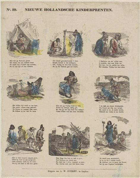 This is Frederik Christiaan Fuchs’s undated print, made with etching on paper, titled "Elk kind dat leert met lust en vlijt, / Zijn deze plaatjes toegewijd." The work's power lies in its deceptively simple composition. The grid of nine vignettes, each a self-contained narrative, encourages us to read across and down, searching for connections. Each scene is rendered in a limited palette, the pastel hues creating a sense of childlike innocence. Yet, this surface harmony is undermined by the work's underlying structure. The seemingly random arrangement of scenes disrupts any linear narrative, forcing viewers to create their own meaning. This challenges the conventional notion of a singular, fixed interpretation. Fuchs employs a semiotic system where each image acts as a signifier, but the signified remains open to interpretation. The work destabilizes established meanings and prompts us to reconsider how narratives are constructed and understood.