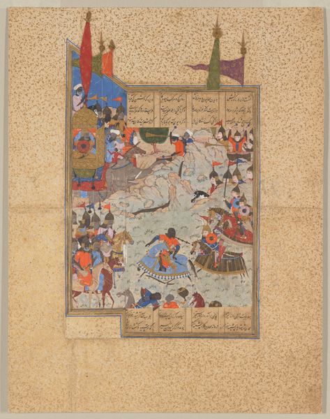 This dynamic composition, "Battle Between Iranians and Turanians," was created by Muhammad al-Qivam al-Shirazi, a 16th-century artist, as part of a Shahnama, or Book of Kings. The scene bursts with energy, utilizing vibrant colors and intricate detail to depict a chaotic clash of armies. The artist employs a layered perspective, stacking the figures and action to create a sense of depth and intensity. Note how the dense arrangement of figures leaves very little negative space, intensifying the feeling of being caught in the melee. Bands of text, like architectural friezes, punctuate the image, dividing and framing the scene. This structural technique enhances the symbolic significance of the battle within a narrative framework. Consider the way the artist uses color to distinguish between the armies. This allows viewers to decode the visual narrative and understand the power dynamics at play within the composition. The overall effect challenges the viewer to decipher its complex layers.