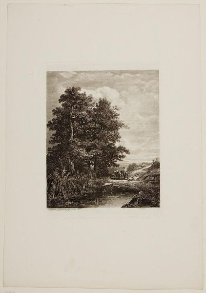 Curator: Alexandre Calame, a Swiss artist active in the 19th century, created this scene, titled "A Winter Scene with Stream and Snowy Fir Trees," now residing in the Harvard Art Museums. Editor: The density of the marks used to create this snowy scene is striking; it really conveys the crisp, cold air. Curator: The artist’s skillful rendering of light and shadow is quite notable, effectively defining the snowy landscape's textures and forms. How do you see this piece relating to wider trends in landscape art? Editor: It’s interesting. The image emphasizes a sublime view, but on close inspection, it is made with a repetitive, almost industrial use of etching. It’s a commodity, in a way. Curator: I agree. The proliferation of printed images allowed for wider access to nature scenes, shaping public perception and even driving tourism. Editor: Ultimately, it prompts me to reflect on how representations of nature, like this print, can impact our relationship to the environment and the art market.