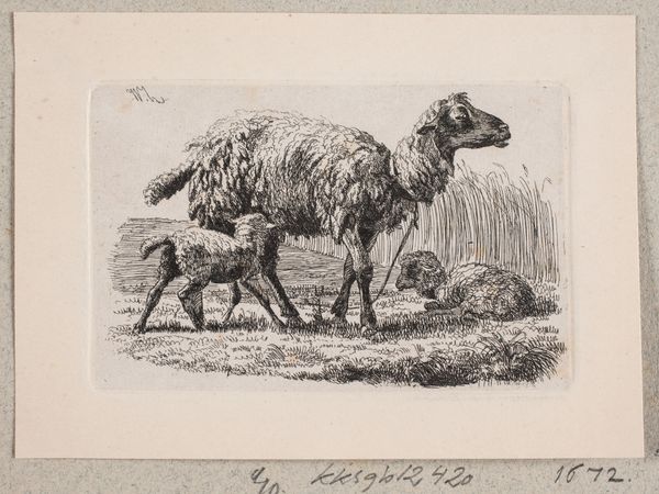 Eugène Verboeckhoven created this print, "Schaap met twee lammeren," using etching techniques. The composition centres on the sheep and lambs, rendered with meticulously fine lines that delineate their forms and fleece. Observe how Verboeckhoven uses hatching and cross-hatching to create a rich tapestry of light and shadow. This not only defines the three-dimensional forms but also imparts a tactile quality to the animals' wool. The use of light and shade gives depth to the composition. Consider the historical context of the 19th century, during which Realism and Romanticism intertwined. This print reflects a Realist focus through its detailed observation, yet it also subtly romanticizes rural life. By carefully studying the interplay between realism and romanticism, we can appreciate the complex dialogue within the print. The seemingly simple pastoral scene is imbued with nuanced cultural meanings.