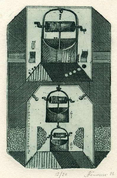 Curator: This intimate artwork is Oleksandr Aksinin's 1980 intaglio etching, "Exlibris of Tanya K." The work operates as a personalized bookplate, rendered in monochrome tones. Editor: Monochrome is right. This thing is somber, almost haunting. Like peeking into a forgotten scholar's dusty study, lit by a single, ethereal light. You just know the silence in that room is thick enough to spread with a knife. Curator: That mood resonates strongly with Aksinin's broader artistic concerns. He was working in Soviet-era Ukraine where cultural expression was often heavily policed. This quiet interior could signify a space of personal freedom, intellectual resistance, perhaps even coded dissent accessible only to the initiated. Editor: Initiated, huh? The curtain above that bust definitely looks like a masked figure staring back at me. Is it a Rorschach test or some avant-garde, Eastern Bloc batman lurking in the shadows? Either way, it’s super unnerving. Curator: Well, consider also the 'Exlibris' tradition itself—claiming ownership of knowledge, carving out space for intellectual identity in a regime that often sought to collectivize thought. Tanya K., whoever she may be, possesses books; she values ideas. And Aksinin visualizes that assertion for her. Editor: Makes you wonder what Tanya was reading! Maybe samizdat copies of Orwell, or Derrida smuggled in from Paris. This makes the etching even more compelling—it’s a little badge of rebellion, a quiet assertion of individuality amidst the gray of conformity. Curator: Exactly. And Aksinin, operating within that complex environment, used techniques like intaglio—etching and engraving directly into the metal plate—to create detailed, evocative miniature worlds brimming with symbolic weight. He pushes against the imposed cultural narrative, creating avenues of subjective interpretations, a hallmark of much dissident art from that period. Editor: I guess it is more than just some gloomy room. All that deliberate artistry gives the image real gravitas—makes me appreciate the craft involved and how carefully it seems staged. I can almost feel the texture of the paper and ink… it's beautiful in a strange way. Curator: Beautifully defiant, perhaps. Ultimately, the power of "Exlibris of Tanya K." lies in its capacity to prompt reflection on those intricate dynamics of art, identity, and resistance during a complex era. Editor: Agreed. Makes me want to dig into some banned books now. See what other secrets are hiding in plain sight.