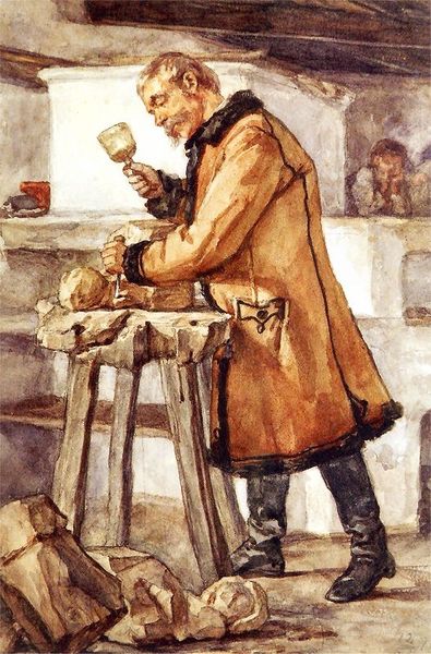 Curator: This is Henryk Rodakowski's "Ukrainian," painted in 1868. It presents a full-length portrait of a man standing in what appears to be a snowy, rural setting. Editor: He certainly looks ready for winter! The fur-trimmed coat is wonderfully tactile; I can almost feel the roughness of the wool and the softness of the fur. And it is watercolor! Very well executed, indeed! Curator: Indeed. Rodakowski was known for his portraits of Polish aristocracy and intellectuals. Though, notably, here, rather than capturing a figure of high society, he portrays a man from what appears to be a different social class, evident in his attire. It prompts questions about the artist’s shifting social focus and who gets represented in art at specific junctures of history. Editor: The coat is rather fascinating, actually. The craftsmanship involved in its making—the tanning of the hide, the furrier's skill, even the embroidery details, it suggests a localized production. Not a factory churning out coats, but individual makers using traditional methods, thus grounding it in very material and social reality. Curator: The timing is crucial too. The 1860s in partitioned Poland were marked by a rise in national consciousness after the failed January Uprising in 1863. Rodakowski painted portraits reflecting Polish identity through individual likeness, which aligns with broader social movements emphasizing regional culture as resistance. Editor: Absolutely. And to think of it from the wearer’s point of view, such attire provides physical and cultural comfort, right? A shield, even, against the elements and social forces pressing down. That's where the material resonates, you can read its history like a text. Curator: A very insightful interpretation. The context certainly lends to reading the piece not just as a personal portrayal but as a statement about the era. It demonstrates how portraiture can act as both a mirror reflecting individual character and a window into understanding cultural dynamics. Editor: And the choice of watercolor, a medium often relegated to studies or preliminary sketches, makes you wonder: was it deliberate to emphasize accessibility, in contrast to grand oil paintings which cater more to aristocratic tastes? It invites a more inclusive examination of art production. I appreciate the humble qualities of watercolor painting and materiality. Curator: A worthy perspective! Ultimately, "Ukrainian" offers multifaceted narratives about individual experience within a turbulent sociopolitical climate. Editor: It's a fascinating display of history imbued within both representation and matter. I am convinced the way something is crafted tells us as much, if not more, than what is ostensibly depicted.