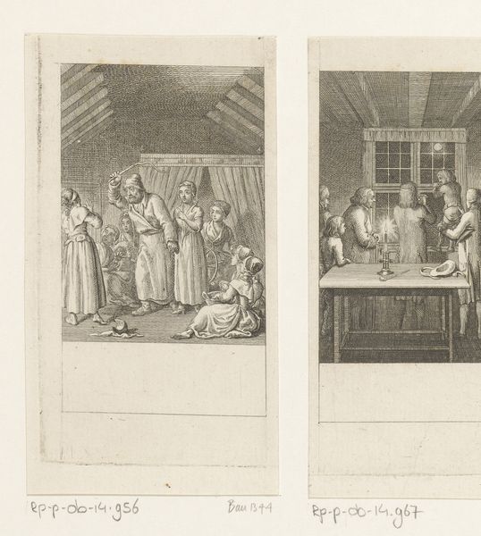 Daniel Chodowiecki made this print of Karel van Lotharingen in gesprek met Michel de l'Hopital using etching techniques. The image depicts a meeting between Charles of Lorraine and Michel de l'Hôpital, a 16th-century French statesman. Made in the late 18th century, this print reflects the Enlightenment's interest in historical subjects and moral lessons. Chodowiecki was a prominent printmaker in Berlin, and his work often carried social and political commentary. In the context of the late 1700s, consider how the artist’s choice to represent a scene of diplomacy and negotiation might have been commenting on contemporary political issues, such as the power dynamics within Europe. The setting of the meeting, a formal interior adorned with portraits and heraldry, suggests the importance of tradition and authority. Further research into Chodowiecki’s other works and the historical context of this print could reveal deeper insights into the social and institutional forces shaping artistic production. The meaning of art is always contingent on social context.