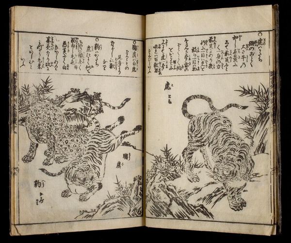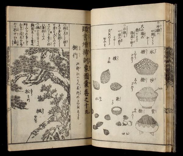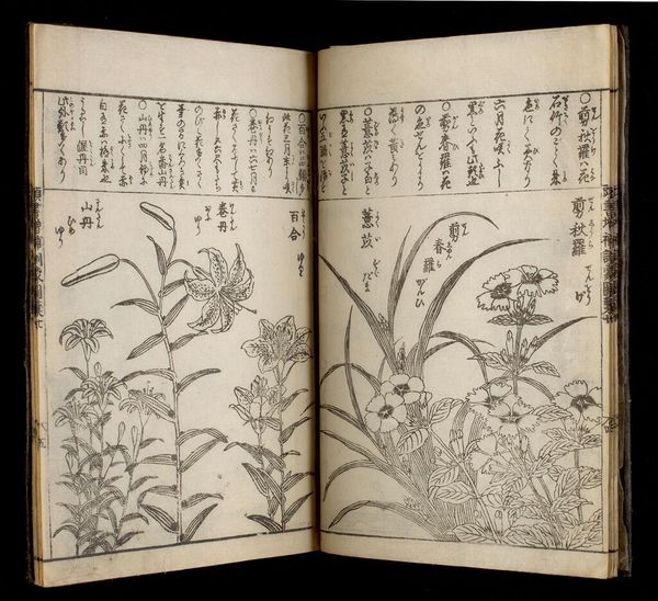 Curator: Here we have volume seven of Nakamura Tekisai’s "Great Illustrated Encyclopedia, Revised and Enlarged." Look at these delicate depictions of insects. Editor: My first impression is one of stillness, a kind of entomological tranquility. The composition is spare, yet somehow teeming with life. Curator: It’s remarkable how these encyclopedia illustrations functioned in society, standardizing knowledge and shaping perspectives on the natural world. Editor: Absolutely. The dragonfly, for example, often symbolized summer and change in Japanese art. I wonder what cultural nuances these insects carried for viewers at the time? Curator: Considering the rise of natural sciences during the Edo period, it’s possible they reflect a growing desire to classify and control nature. Editor: Perhaps. Or maybe it's the simple enduring fascination with the miniature dramas playing out in our gardens. Curator: Yes, a vital reminder that the pursuit of knowledge is always influenced by social and cultural currents.